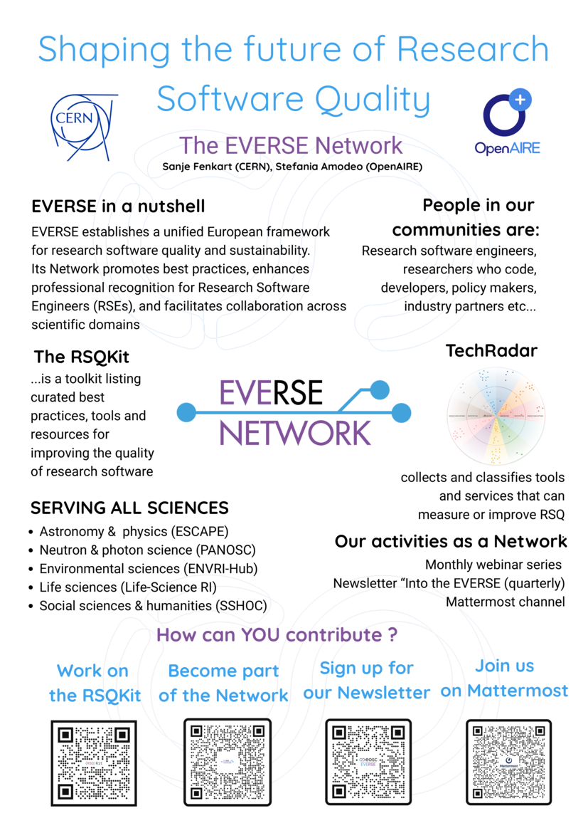 EVERSE is a project in the scope of the European Open Science Cloud (EOSC) which focuses on elevating the recognition and acknowledgement of research software engineering.