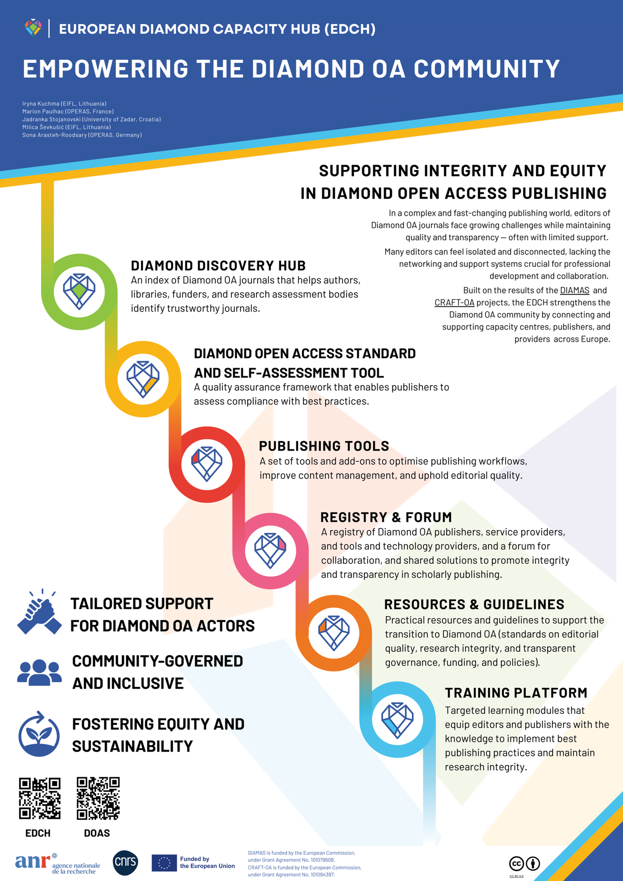 The European Diamond Capacity Hub (EDCH) is a collective designed to strengthen the Diamond Open Access (OA) community in Europe. It offers open, FAIR-aligned services, tools and best practices through a dedicated online platform, providing targeted support, training, and networking opportunities to Diamond OA community members.