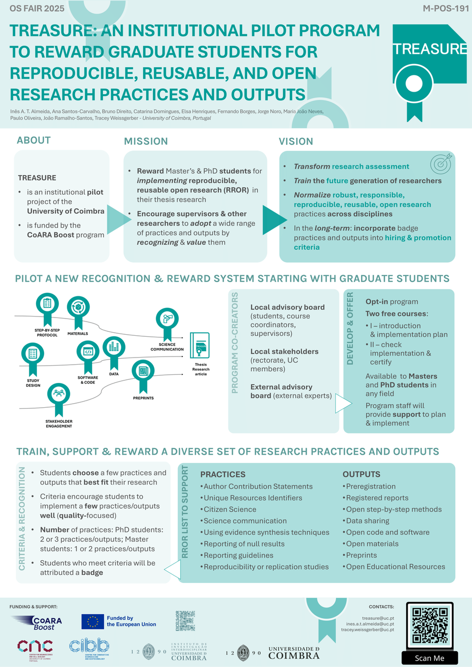 In this implementation-focused opt-in pilot program, we aim to offer University of Coimbra Masters’ and PhD candidates a formal reward for implementing reproducible, reusable and open research practices in their thesis research. We are co-creating the reward criteria with a Local Advisory Board (graduate students, course coordinators, and supervisors), with advice from an expert External Board.