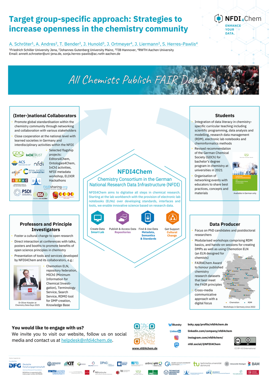 Acknowledging the pivotal role of professors and principal investigators in fostering a culture of openness, NFDI4Chem engages in networking and conferences to promote data sharing.